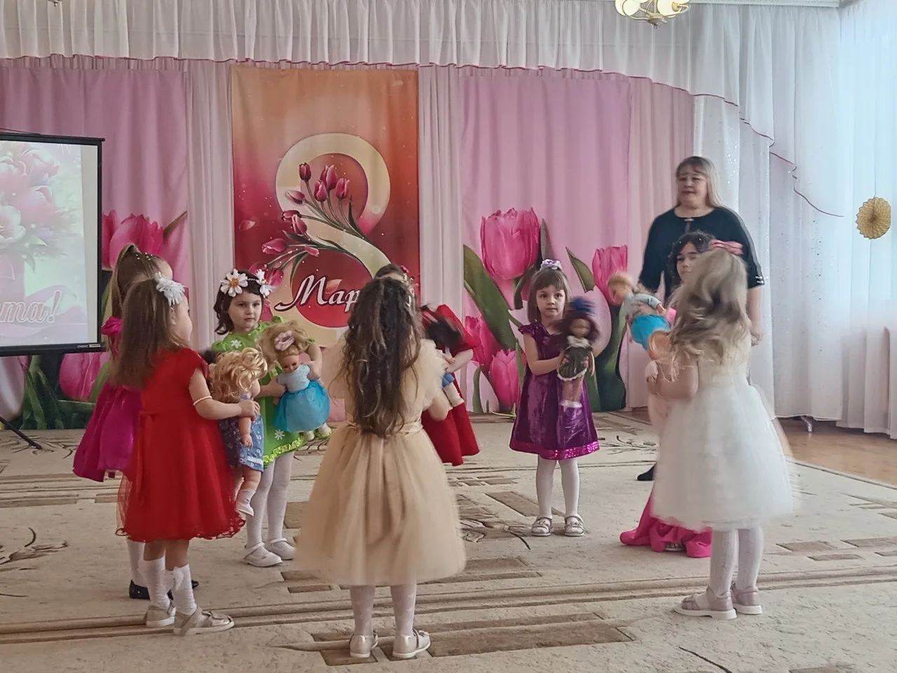 Весна - особое, волшебное время года, любимое всеми. Её с большим нетерпением ждут не только взрослые, но и дети. Ведь именно весной можно увидеть пробуждение природы, ощутить солнечное тепло, услышать щебетание первых перелётных птиц. Чем не повод для праздника? В наш детский сад весна пришла с музыкой, цветами, танцами, улыбкой.
